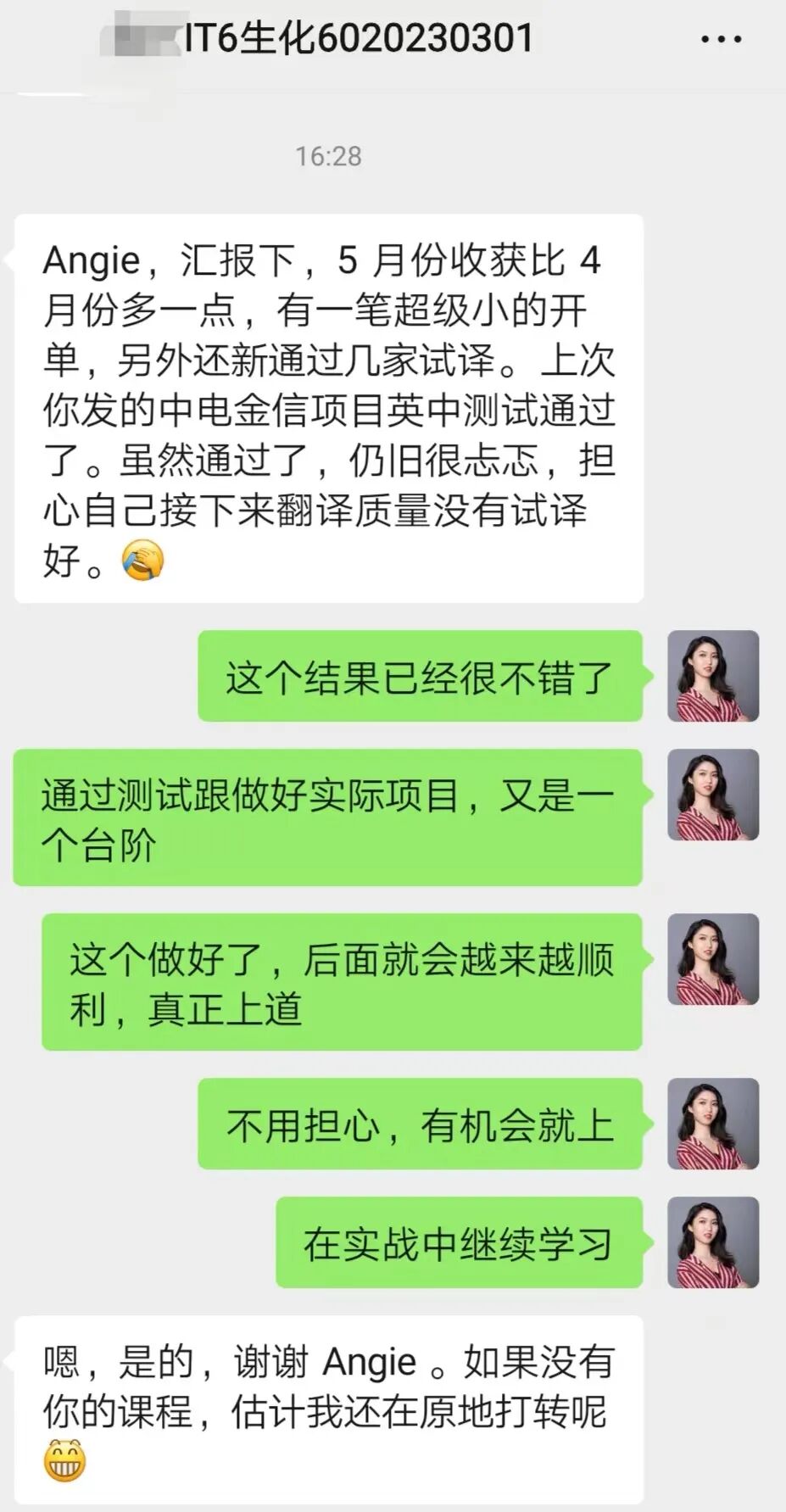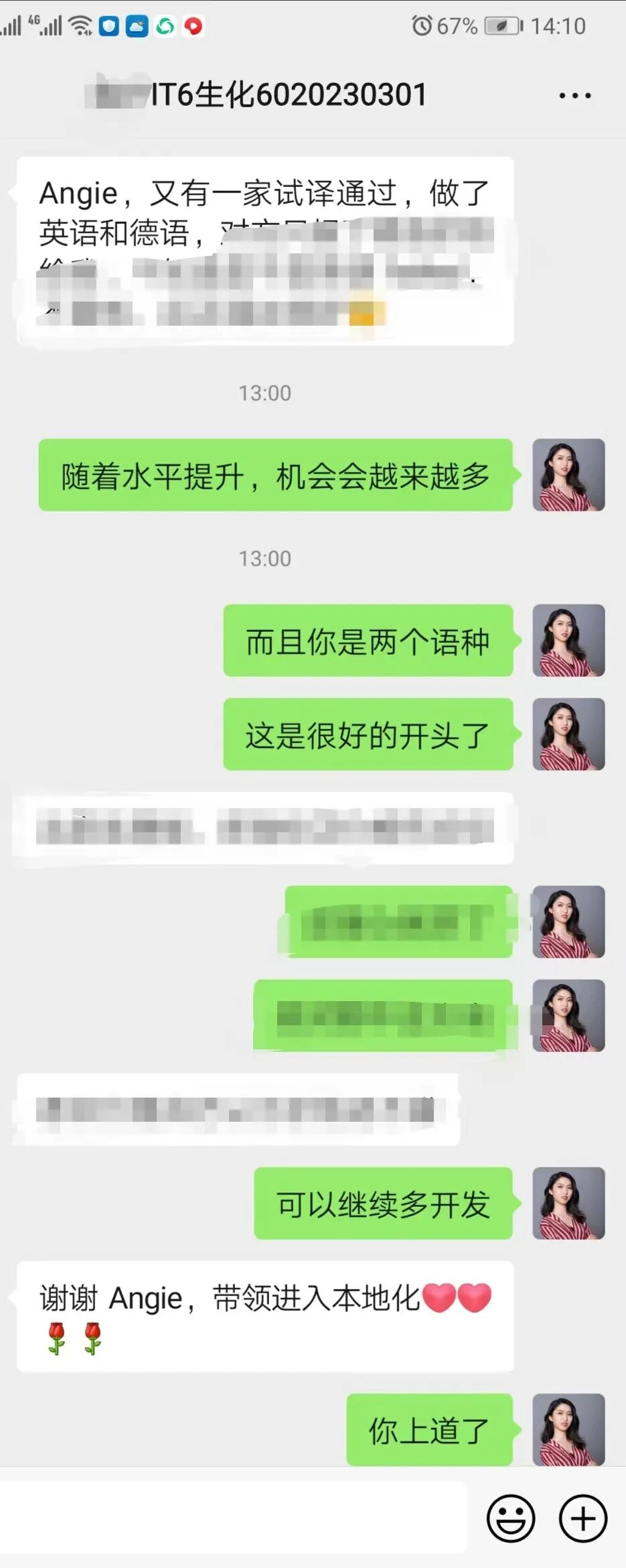 越来越多的学员通过认真坚持训练营学习,做作业、听课、复盘打磨,成功通过翻译公司测试、开单接单。