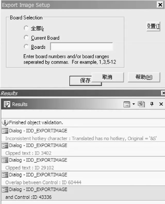 本地化后的文字可能比源语言文字长度增加(字符扩展),通常一个英文单词翻译成1.7个汉字,所以,翻译后的软件用户界面文字可能因空间尺寸或位置问题,无法完整显示。格式验证是对本地化翻译后的文件进行格式检查和修改。常用的格式验证工具包括Alchemy Catalyst、SDL Passolo、Microsoft LocStudio等,这些软件可自动验证本地化翻译过程中引入的各种错误,例如,热键重复、热键丢失、空间重叠、空间文本显示不完整、译文不一致。图2是使用Alchemy Catalyst工具的"Validate Expert"功能对本地化文件中的"Export Image Setup"对话框控件进行验证,显示在"Result"窗口中的验证,结果发现了以下错误:(1)翻译后丢失了热键;(2)控件文本被截断(控件文字显示不完整);(3)控件重叠。